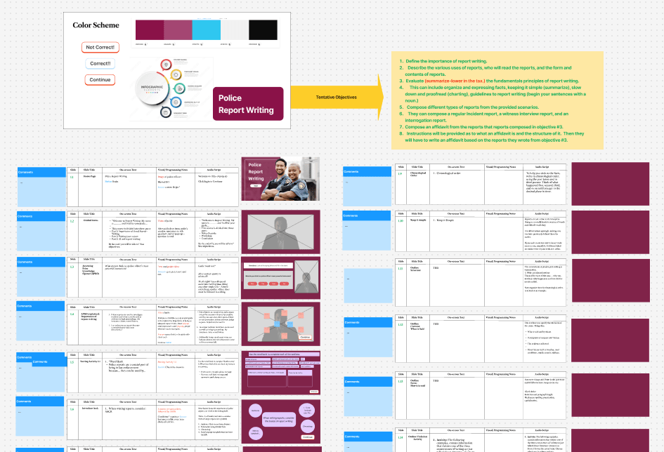 My design process began with research into the fundamentals of report writing. I identified the most common mistakes made by officers made in the field and started to make design concessions. For further support, and to corroborate and confirm my findings, I consulted subject matter experts (SMEs)—including law enforcement professors and legal professionals—to ensure the content reflected real-world needs and regulatory challenges, making the learning objectives practical and relevant.