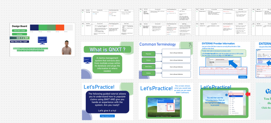 Based on the insights from the SMEs, I developed a detailed action map to visually represent the entire claims processing journey, from initial patient encounter to claim resolution. This map served as the foundation for creating an interactive prototype. The prototype allowed for early testing and feedback on the course’s navigation, interactive elements, and overall user experience, ensuring a smooth and intuitive learning path.
